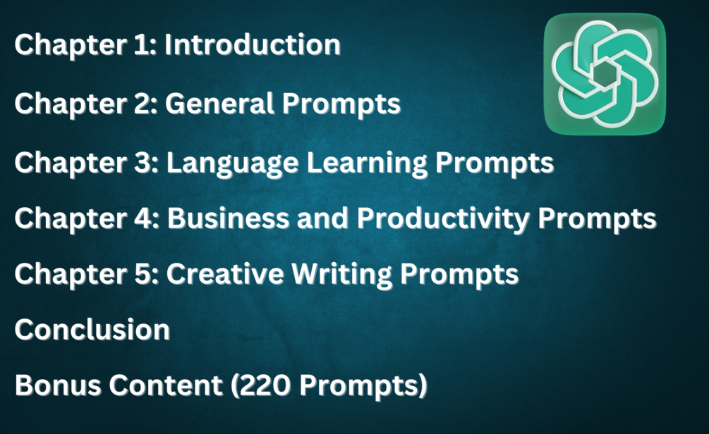 As a bonus, you will also receive 220 ChatGPT prompts, divided into 4 categories: General Prompts, Language Learning Prompts, Business and Productivity Prompts, and Creative Writing Prompts.